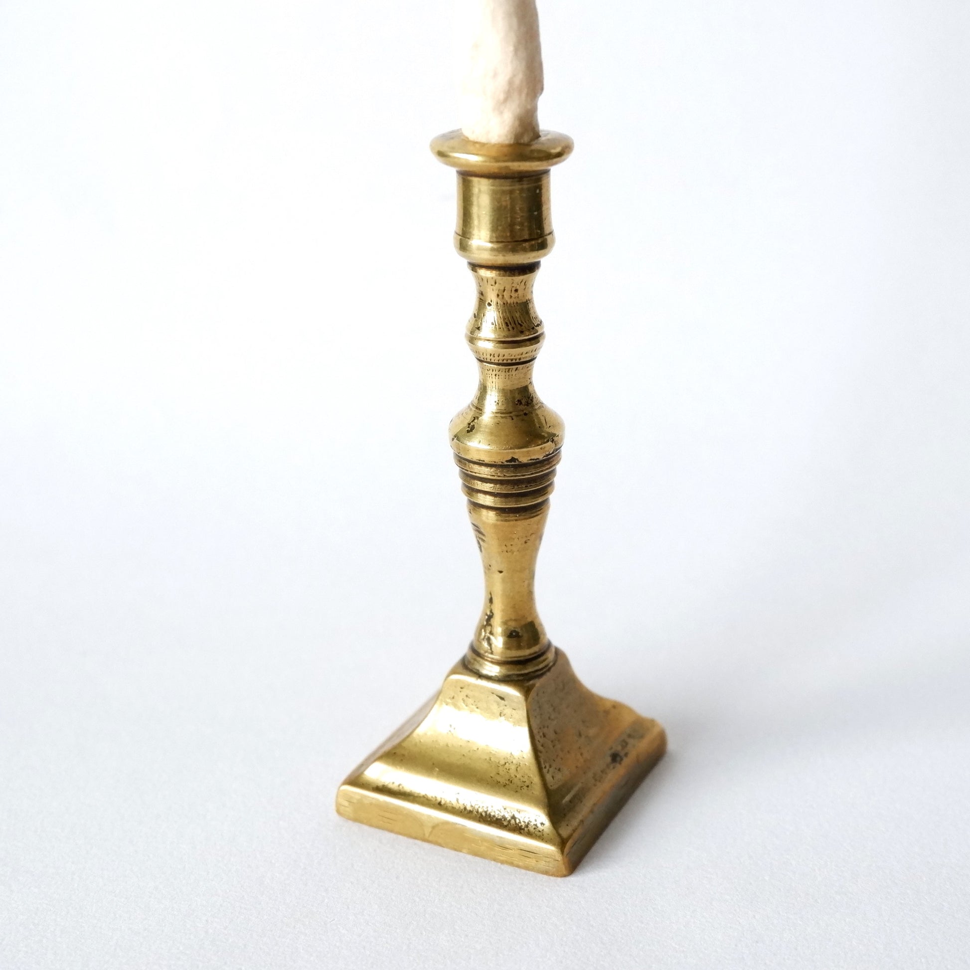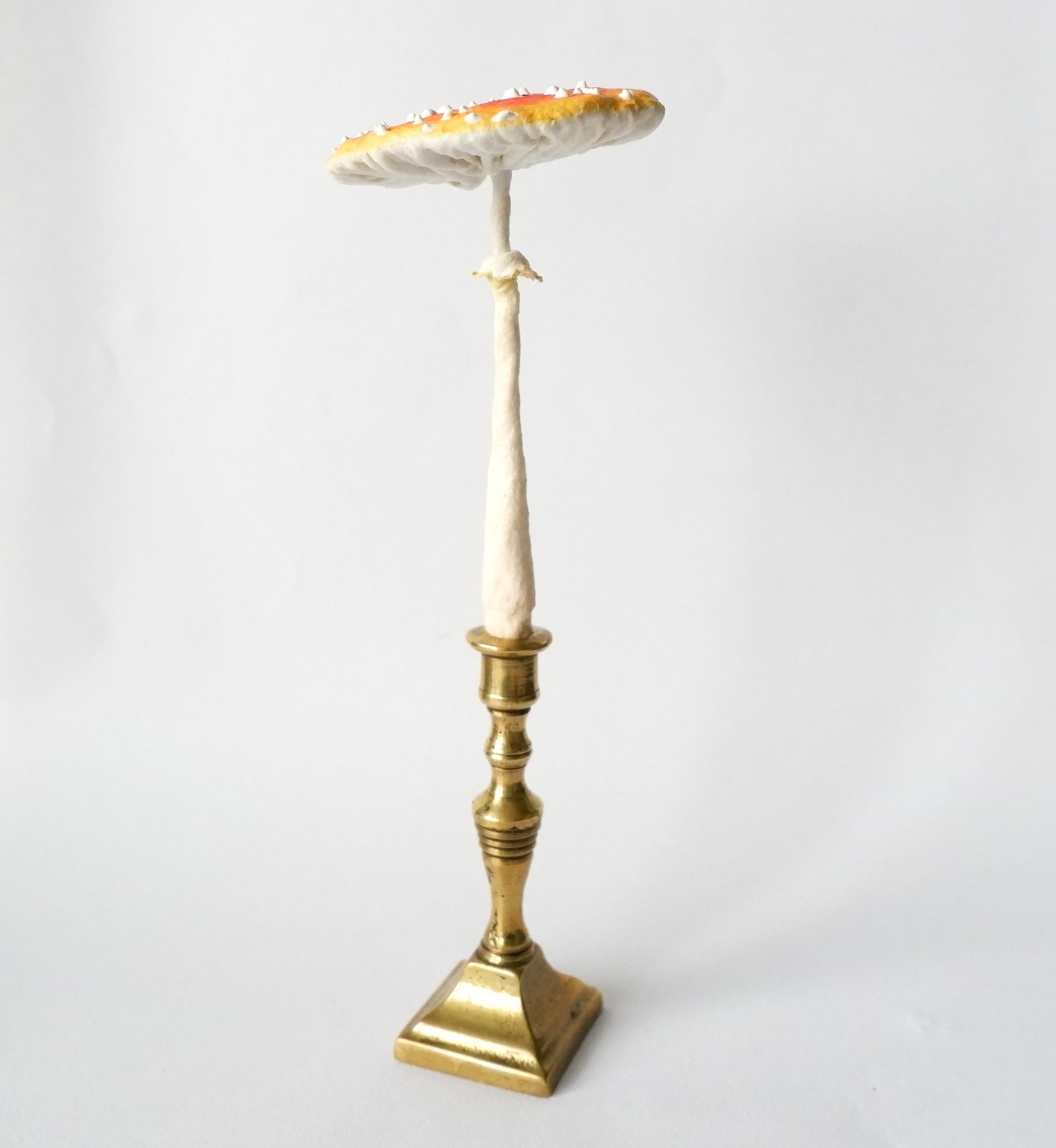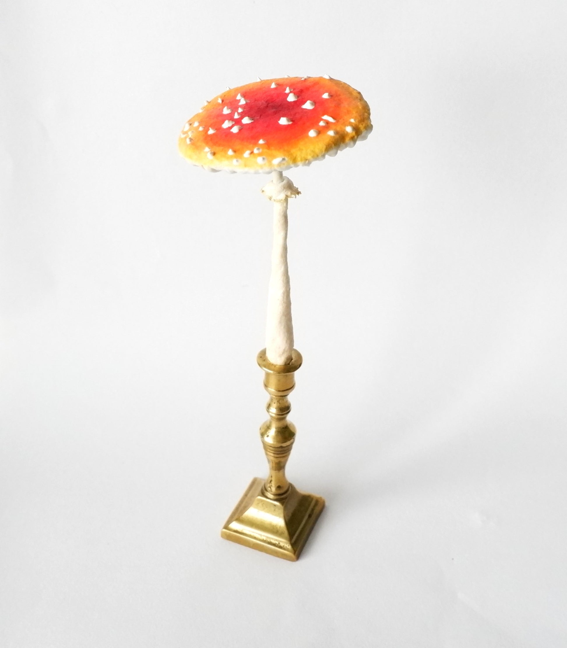 This little toadstool is made from spun cotton and protrudes from a miniature vintage brass candlestick. The candlestick has been polished but retains some of its patina indicative of its history.