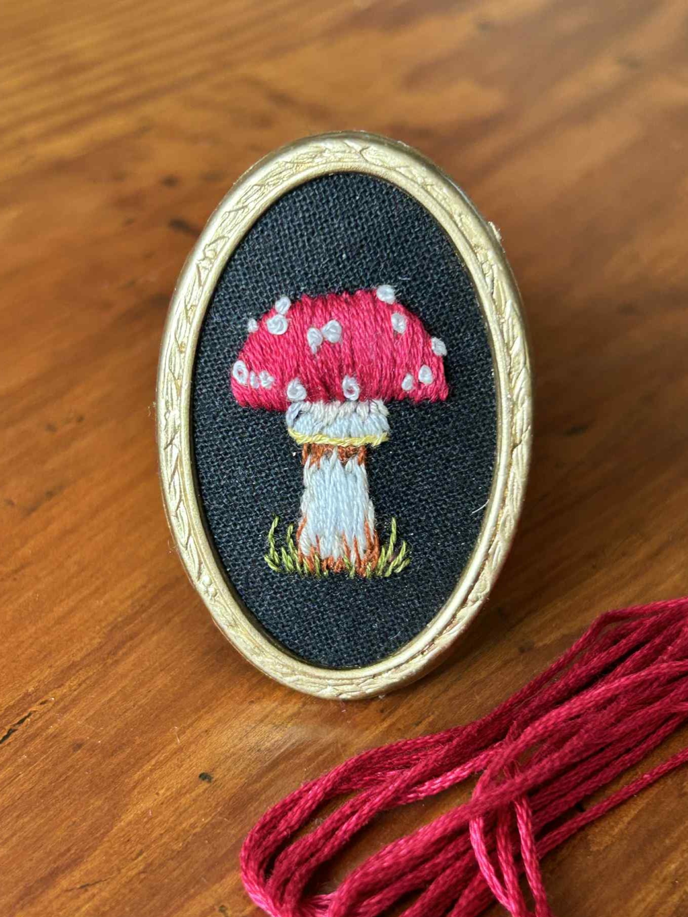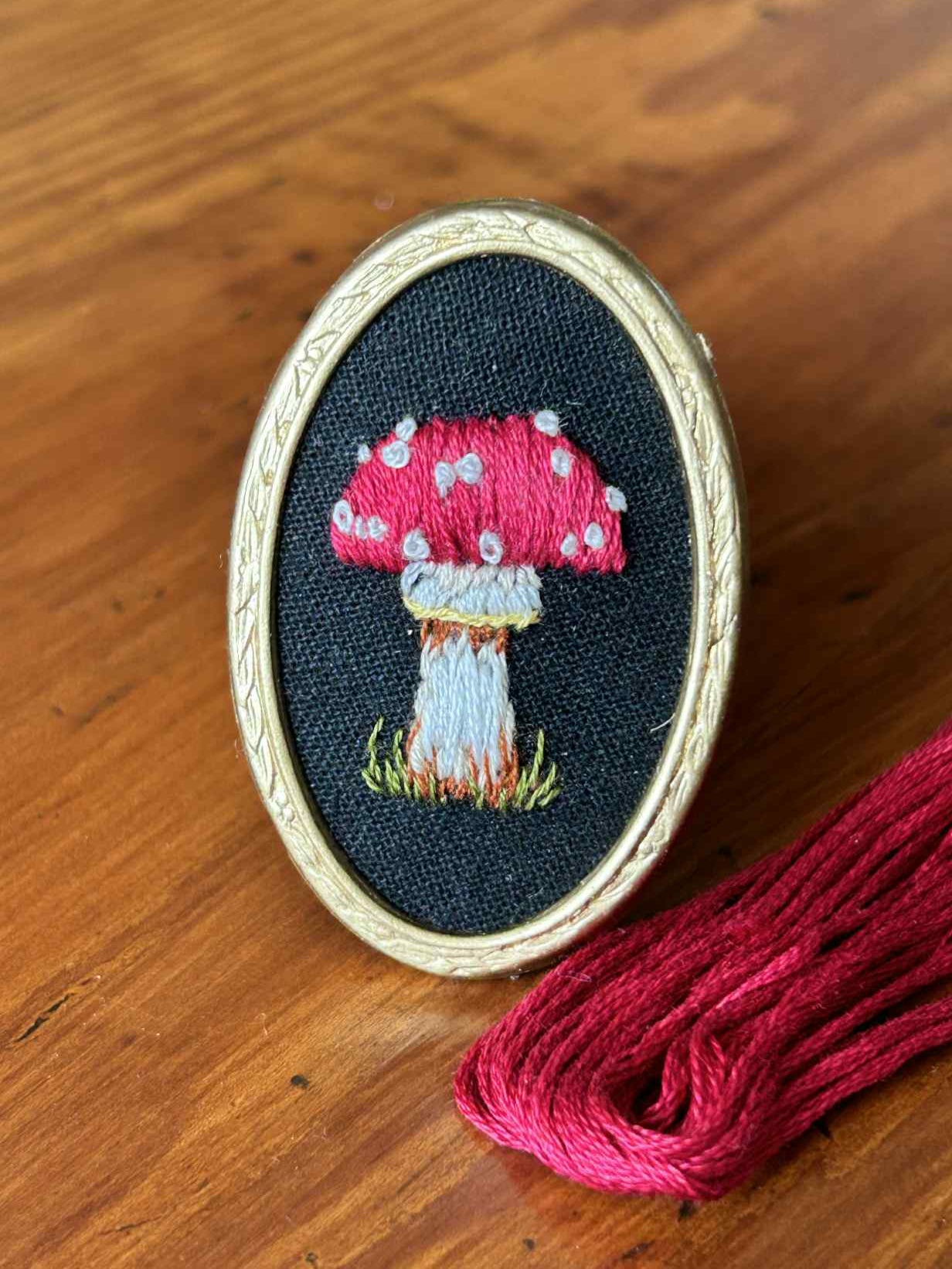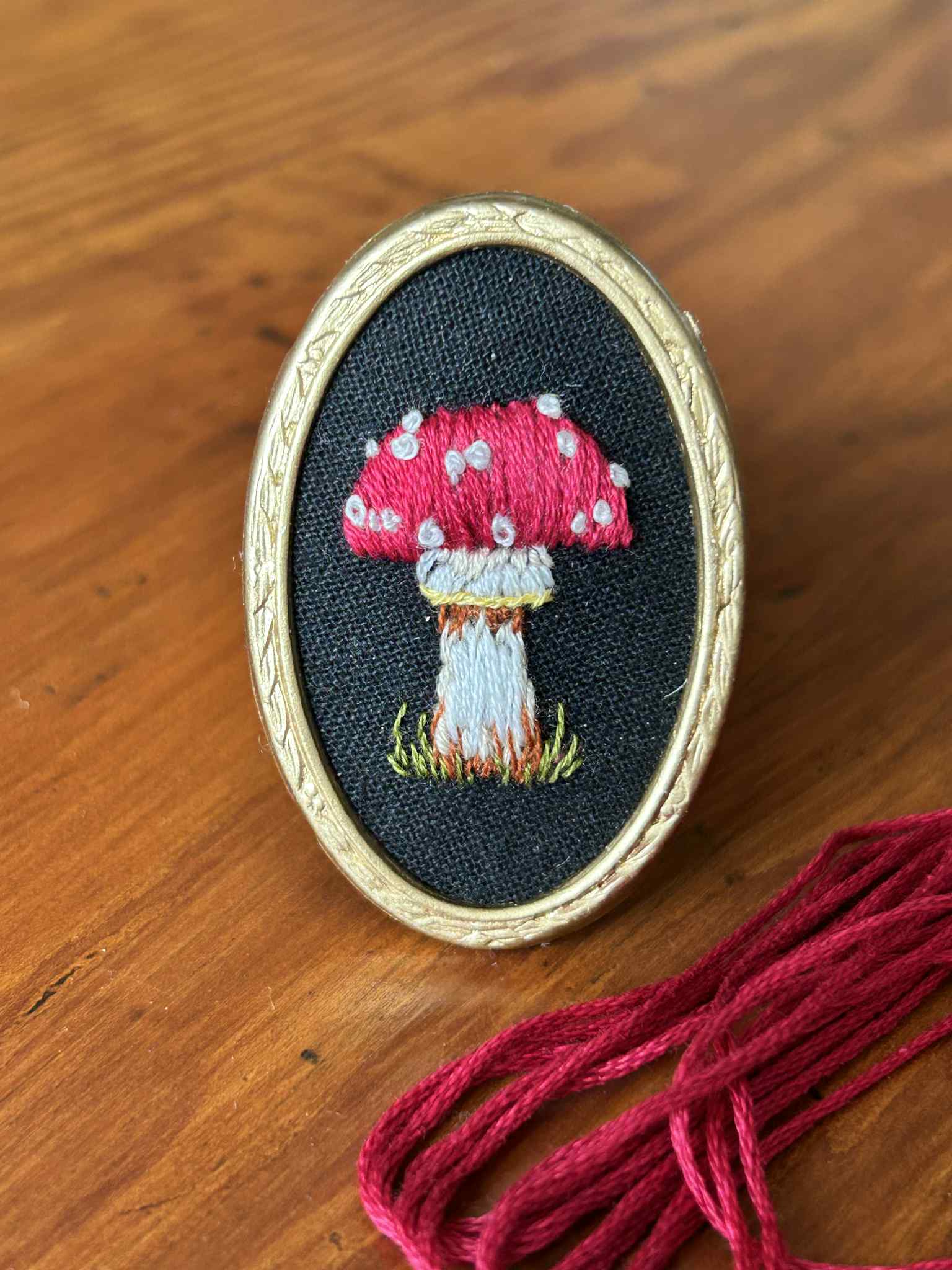 A tiny little world of texture, detail, and magic, this brooch features a charming hand stitched toadstool nestled within an ornate vintage gold frame.