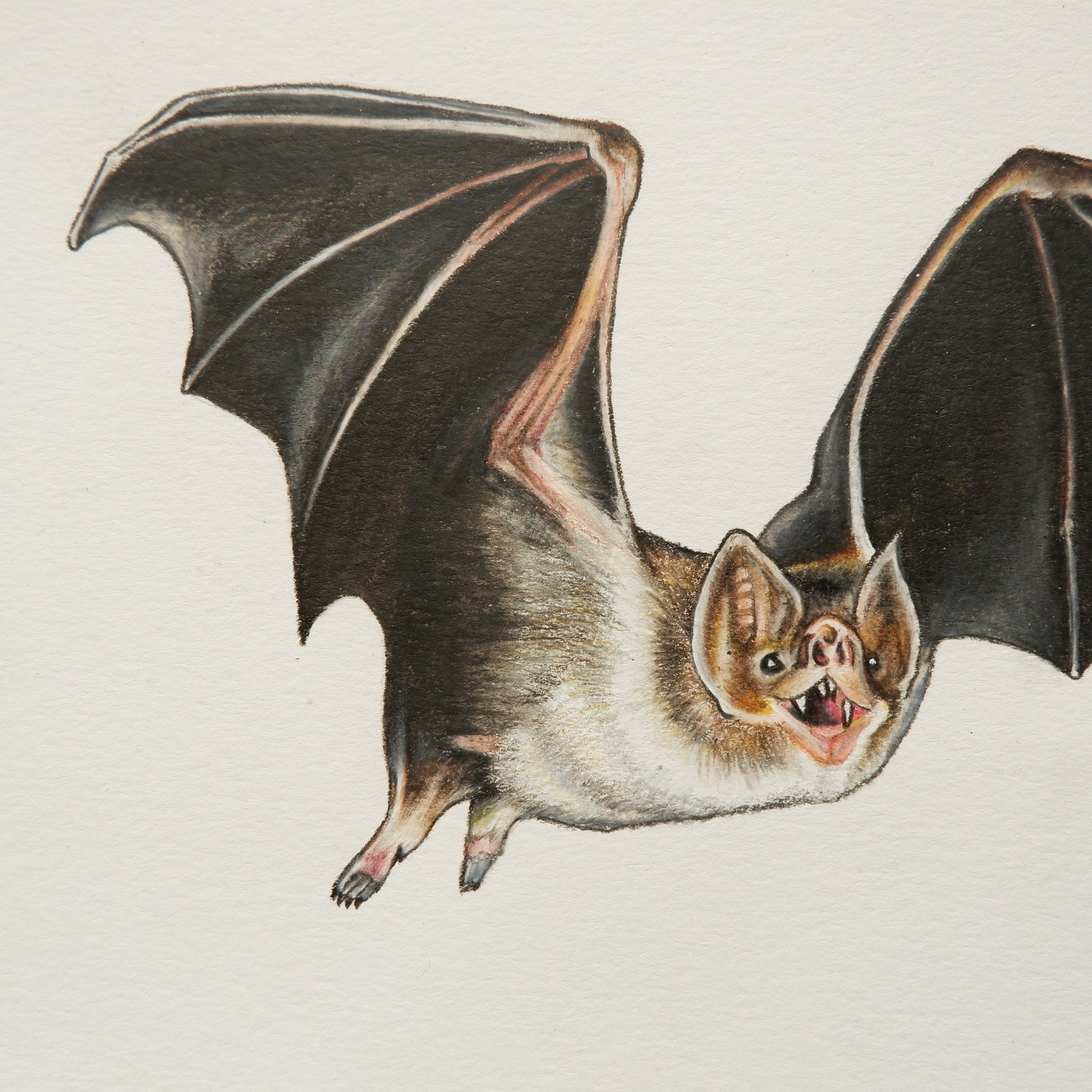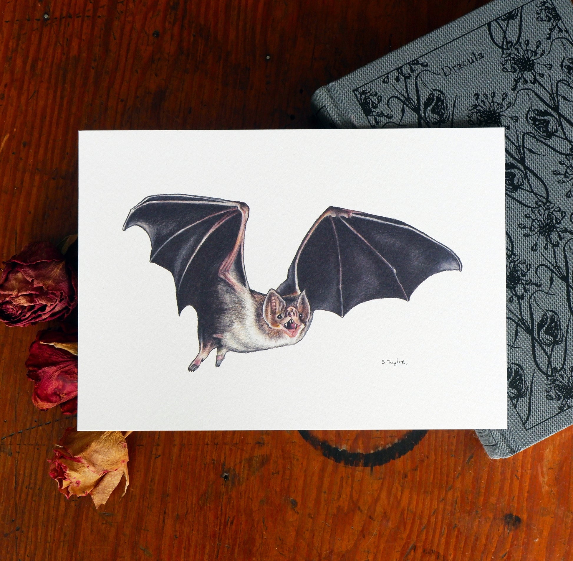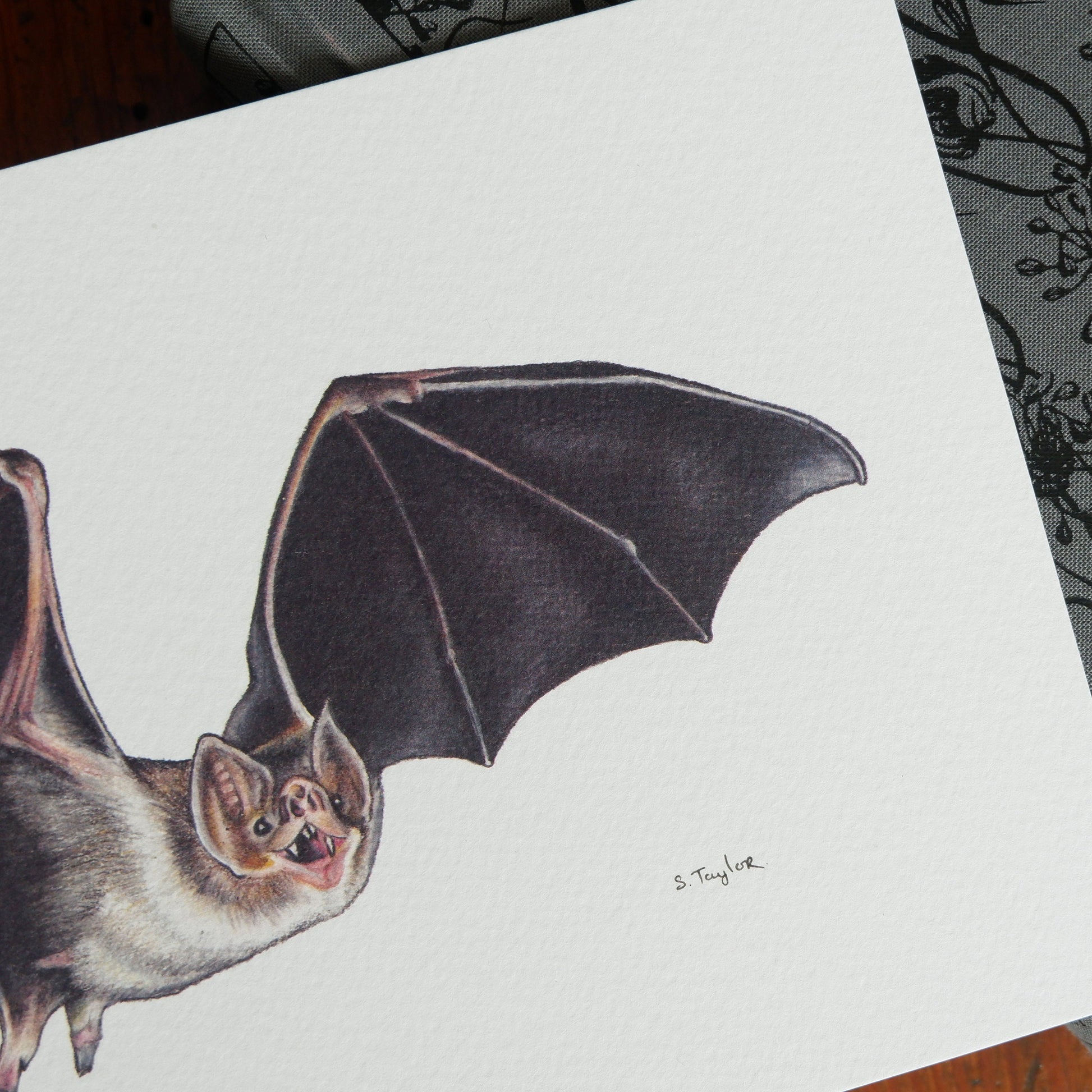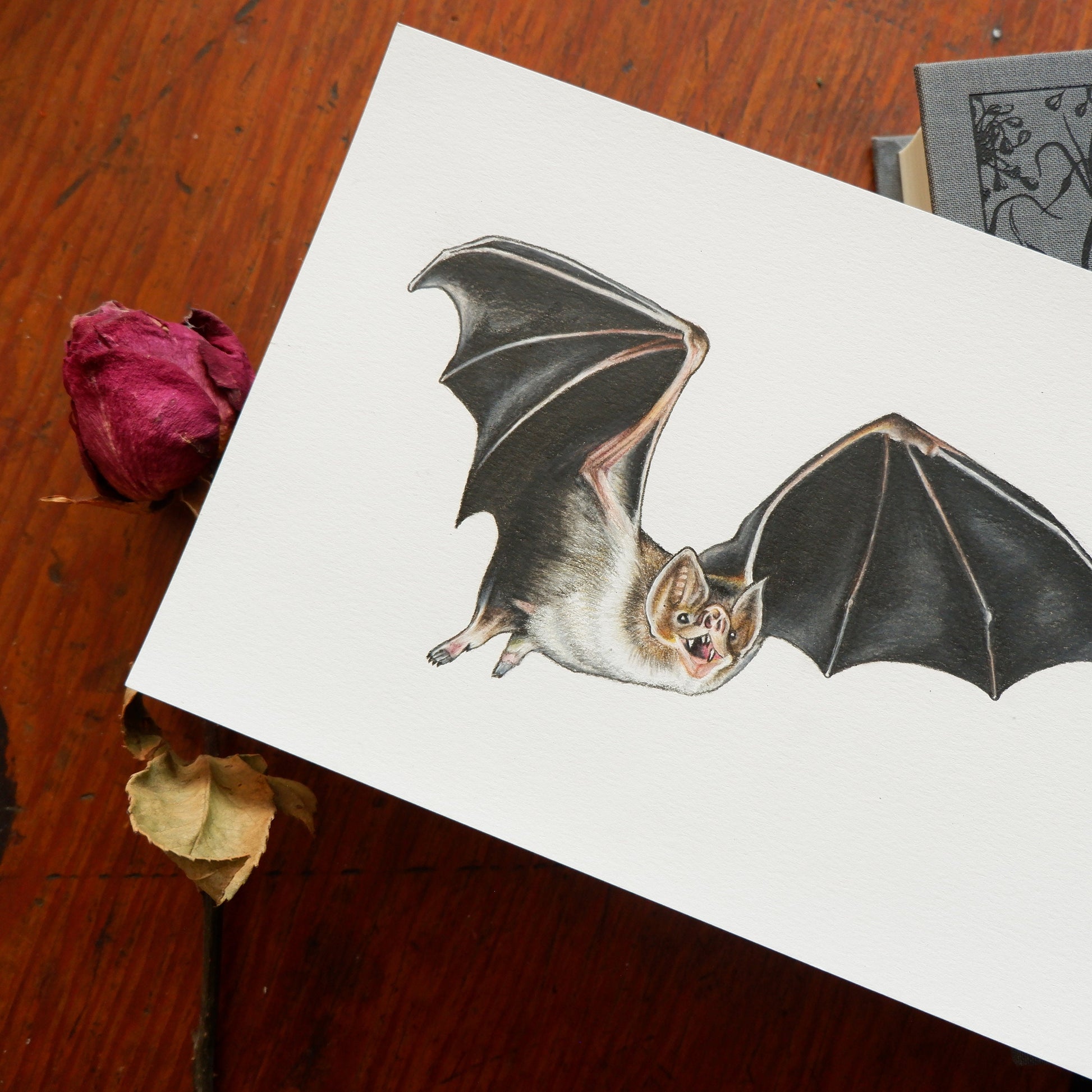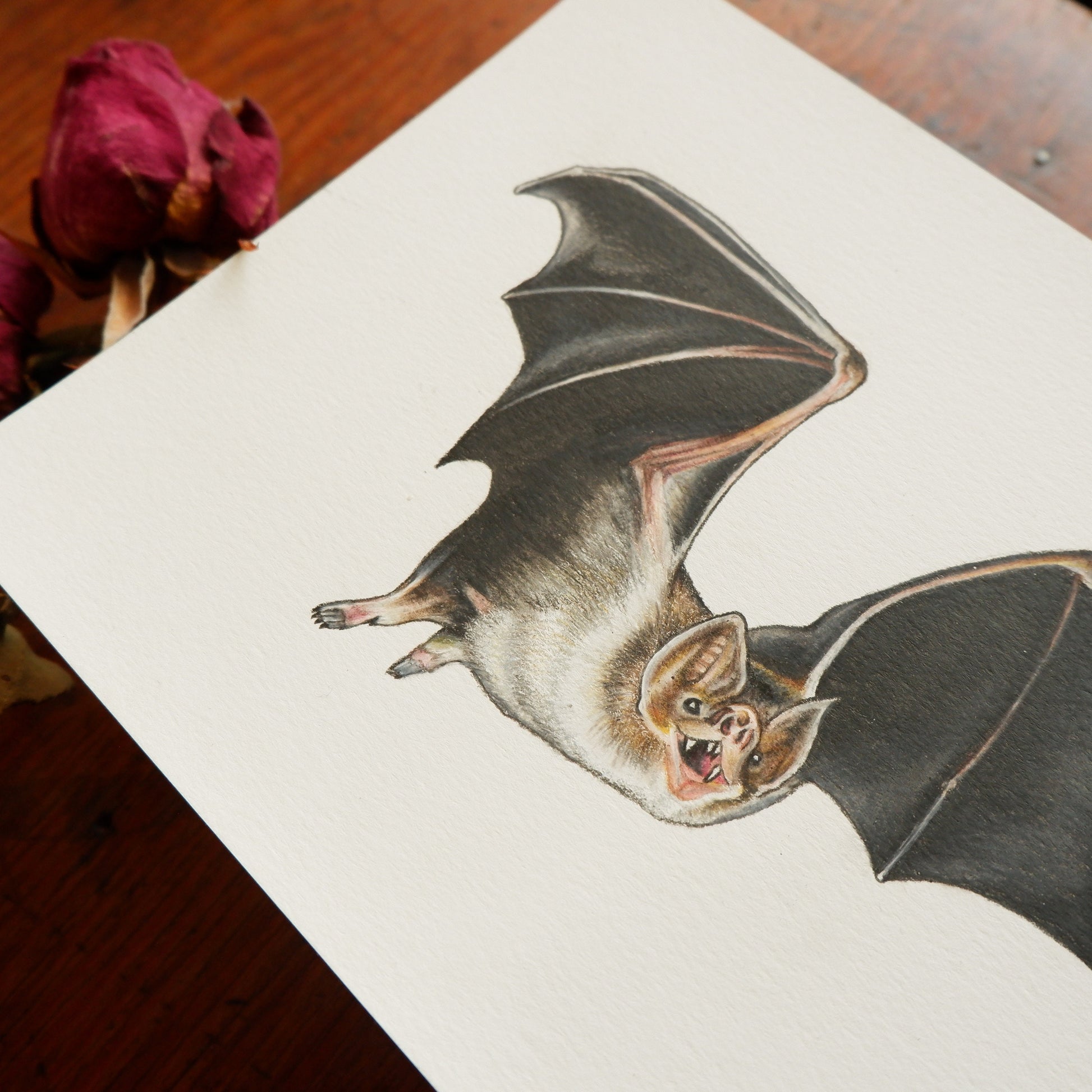This little bat is a signed A5 print version of my original coloured pencil drawing and printed on lightly textured 220gsm Tintoretto Gesso paper.